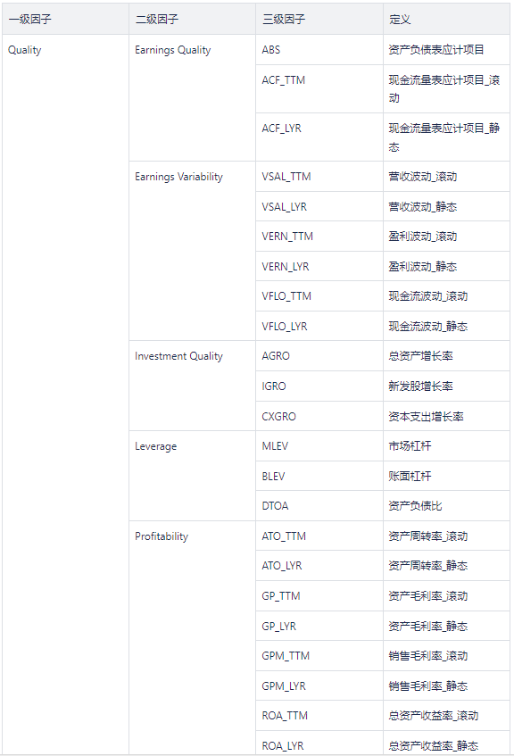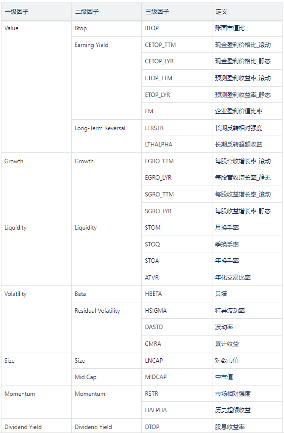 多因子风险模型基于多因子回归体系,将风格因子、市场因子和行业因子与收益率进行联合建模,以获取收益率和特质收益率。本文构建的多因子风险模型以 CNE6 模型为准。