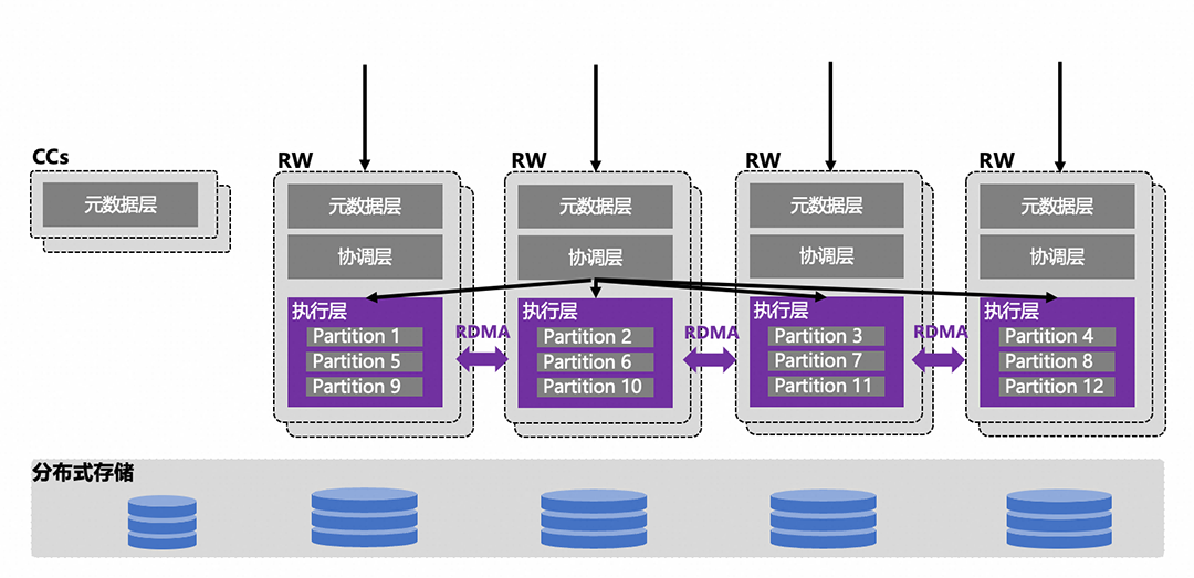 集群中所有节点通过RDMA进行点对点互连,跨机共享RDMA注册的内存CTS Log来实现全局事务状态信息同步和跨物理机直接更新,避免通过中心节点维护全局活跃事务列表,同时CTS Log提供了事务远程提交,状态查询等能力。 通过TSO或HLC两种时间戳管理方案,生成事务提交时间戳,分布式写事务的所有子事务通过相同的时间戳进行原子提交,分布式读通过统一的时间戳结合CTS Log判断数据可见性,保证分布式读一致性。
