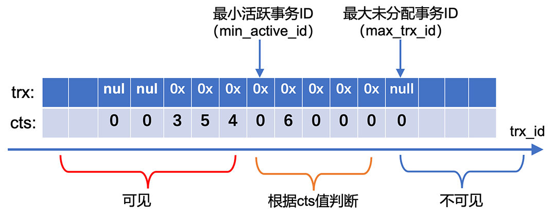 InnoDB原生事务系统是基于活跃事务列表实现的,但维护活跃事务列表需要全局大锁保护,成本开销较大,在高并发场景下容易成为整个系统的性能瓶颈点。另外,考虑到分布式事务一致性方案大多基于提交时间戳方案(TSO/TrueTime/HLC等),因此,PolarTrans通过提交时间戳技术(CTS)优化原生事务系统,核心数据结构为CTS log,由一段ring buffer组成,事务ID trx_id通过取模映射到其对应的slot,每个slot存储trx指针和cts值(事务提交时间戳)。其优化的核心思想是移除对复杂数据结构的维护,事务状态迭代、可见性判断等核心事务逻辑, 都是通过CTS log来完成,更加轻量级;同时PolarTrans将大部分的逻辑进行无锁优化,因此,PolarTrans事务系统对于读写混合场景、纯写场景都有较大的性能提升。