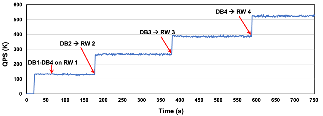 在横向水平扩容测试时,创建的4个DB最开始都在RW1上,压测过程中,逐渐增加RW节点个数,并将DB2-DB4依次绑定到新增的RW节点。图中展示了扩容过程中集群整体的性能变化,表明集群可以实现秒级的水平扩容。
