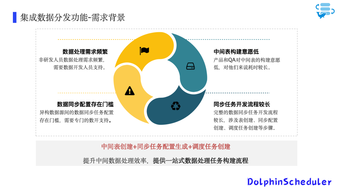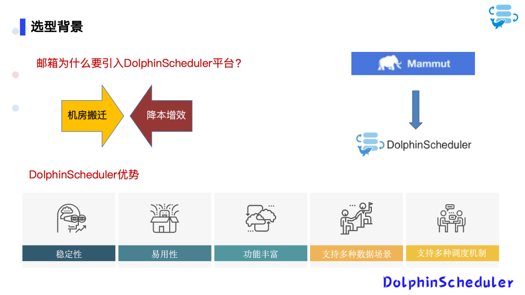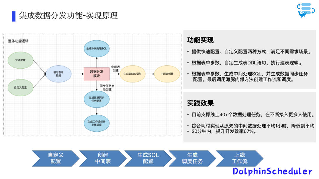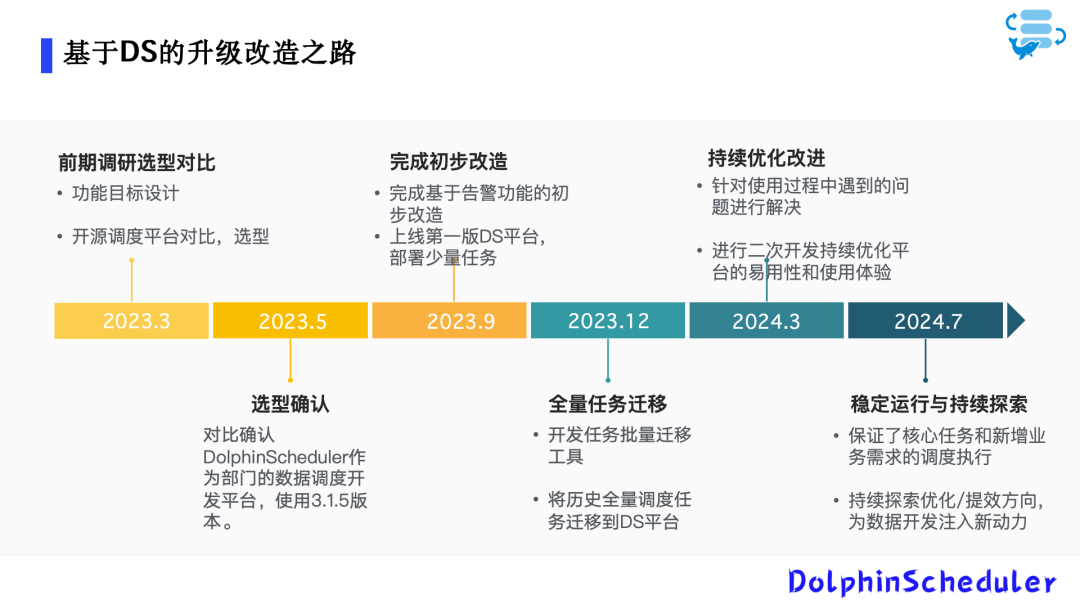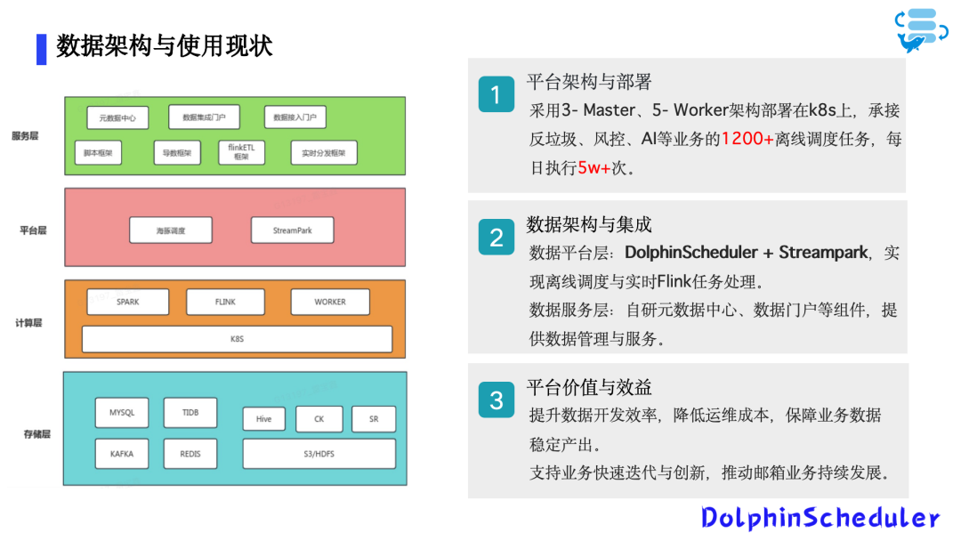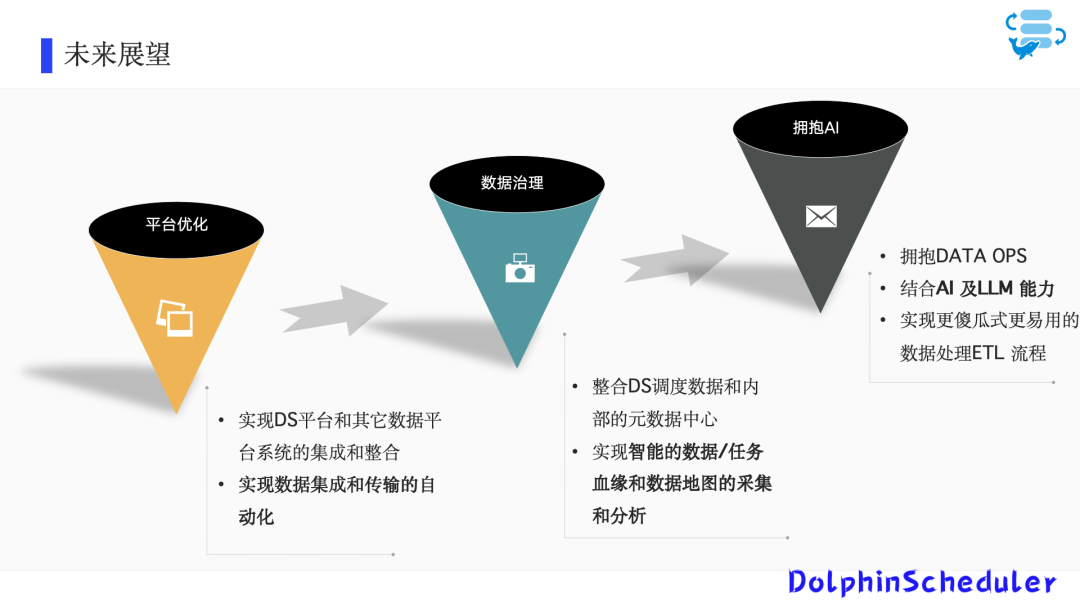 拥抱AI:结合AI及LLM能力,实现更加智能化、易用的数据处理ETL流程,提升数据处理的自动化和智能化水平。 数据治理:整合DolphinScheduler调度数据和内部的元数据中心,实现智能的数据/任务血缘和数据地图的采集和分析,为数据治理提供有力支持。 平台优化:进一步优化DolphinScheduler平台的性能和功能,提升平台的稳定性和可靠性,以更好地满足日益增长的数据处理需求。 拥抱DATA OPS:实现DolphinScheduler平台和其他数据平台系统的集成和整合,推动数据集成和传输的自动化,构建更加高效的数据生态系统。