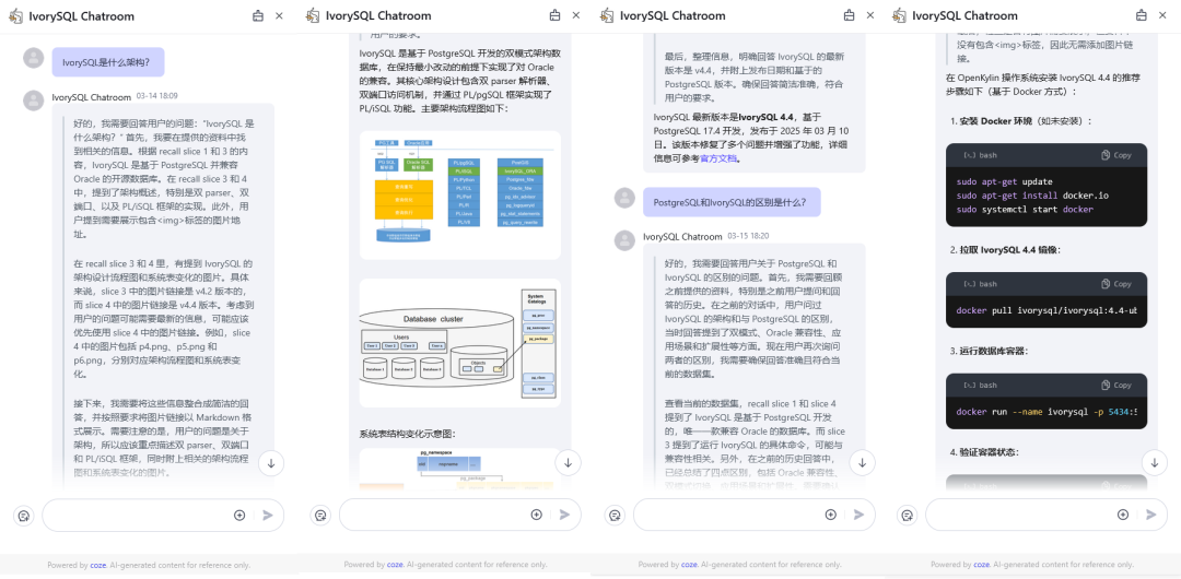为了更好地服务用户,IvorySQL 文档智能助手已在官网上线运行。IvorySQL 在线聊天室基于 Coze 平台和 DeepSeek R1 模型构建,导入了 IvorySQL 官网文档,包括发行说明、快速入门、安装指南、开发者指南、迁移指南、Oracle 兼容功能列表等内容。用户可以在聊天框输入问题,它就能快速生成答案,大幅缩减了翻阅文档的时间。