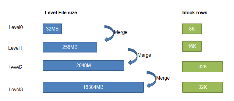 注1: 同属于一个 sortKey 值的数据不会被拆分到不同的 Level File 文件。因此实际场景我们会发现一个 Level File 的文件可能会大于 32 M,若一个 sortKey 值对应的数据量特别巨大,甚至可能达到更高!