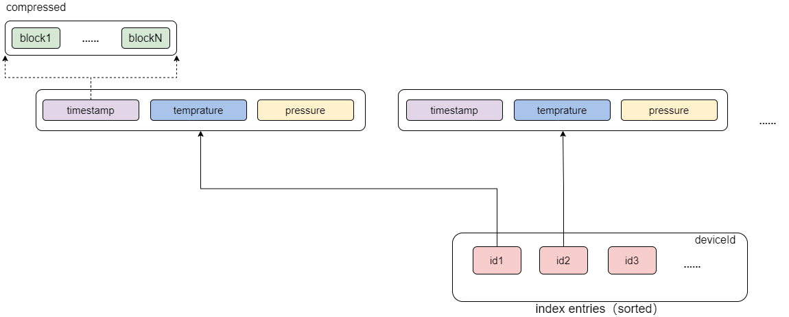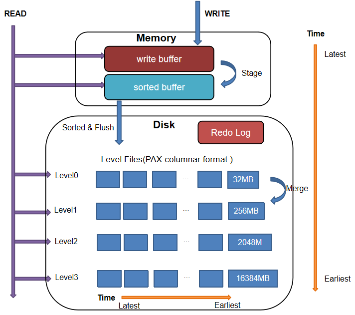 - 写入: 与 LSM-Tree 直接写入一个有序的数据结构不同,DolphinDB TSDB 引擎在写入数据到内存时,会先按写入顺序存储在一个写缓冲区域(unsorted write Buffer),当数据量累积到一定程度,再进行排序转化为一个 sorted buffer。