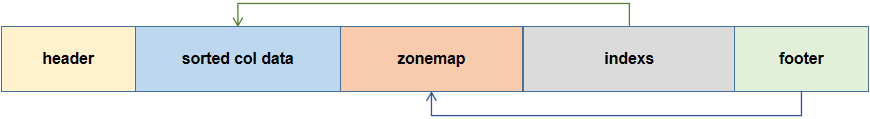 内存索引包含两个部分:sortKey 维护的 block 的偏移量信息(对应 Level File indexes 部分),zonemap 信息(对应 Level File zonemap 部分)。