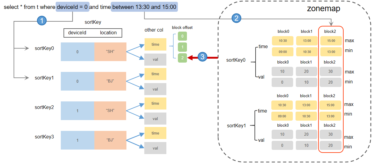 例如,上图 sortColumns=`deviceId`location`time,查询条件 deviceId = 0,则可以快速定位到所有 Level File 中 deviceId= 0 的 sortKey 及其对应所有字段的 block 数据。 - 根据 zonemap 定位 block: 由 1 定位到 sortKey 后,系统会查询对应 sortKey 在 zonemap 里的最值信息(min,max)。如果查询条件提供了 sortKey 以外的字段范围,则可以进一步过滤掉一些不在查询范围内的 block 数据。