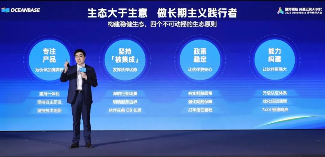 截至目前,OceanBase 服务客户数突破 2000 家,连续四年实现 100% 增长,领跑独立分布式数据库厂商。在生态建设上,OceanBase 伙伴数量已超过 1200 家,其中 100+ 核心经销商贡献 60% 外部业绩,超 10 家专有云伙伴营收破千万、超 10 家公有云伙伴营收破百万。20+ 专业技术服务伙伴,独立交付 30% 项目,伙伴服务收入占比突破 50%。