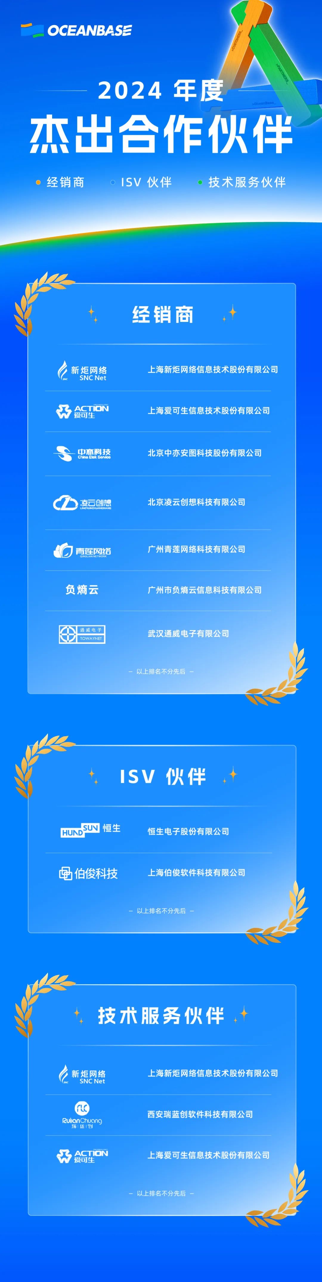 会上,OceanBase 特别颁发 2024 年度杰出经销商、杰出解决方案伙伴、杰出技术服务伙伴三大奖项,对过去一年与 OceanBase 深度协同、共创行业价值的同行者进行表彰和感谢,致敬一路同行的伙伴。(获奖名单见文末)
