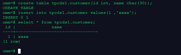 4.在模式tpcds1中建表customer、插入记录和查询记录