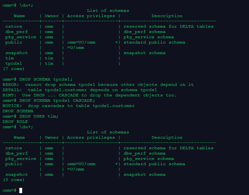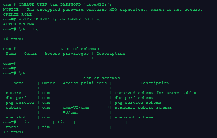 2.创建一个用户tim, 并将tpcds的owner修改为tim,且修改owner前后分别使用\dn+查看模式信息