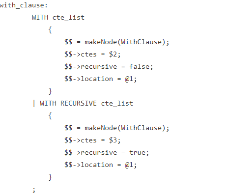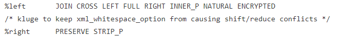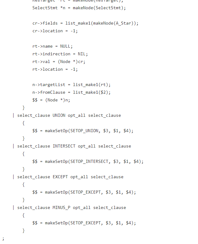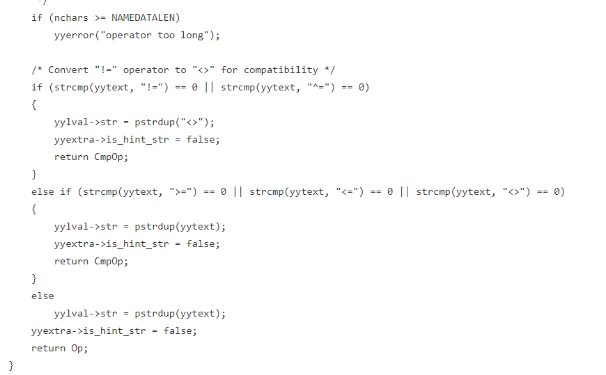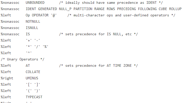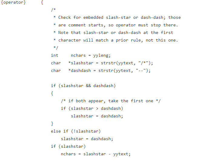 这里,operator的作用是检查是否嵌入斜杠星或者短划线(即注释开始的标志)如果是第一个字符的斜杠星或者短划线,则将要匹配之前的规则,但是不冲突。需要注意,为了SQL兼容考虑,‘+’‘-’不能是多字符操作符的最后一个字符,比如‘=-’,这需要被作为两个操作符考虑。