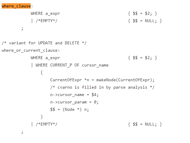WHERE子句给出了元组的约束信息,对应语法定义中的where_clause,与select_into类似,由WHERE关键字和一个表达式组成,对于运算关系,会调用makeSimpleA_Expr函数生成A_Expr结构体,存储表达式的相关信息。A_Expr结构如下,字段lexpr和rexpr分别保存左、右两个子表达式的相关信息。存储表达式名称,操作符名称,左子表达式,右子表达式以及符号出现的位置。