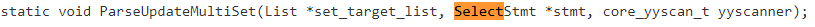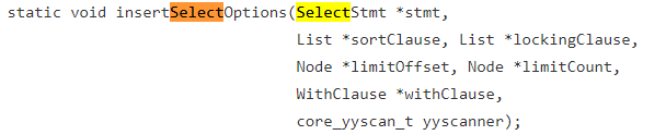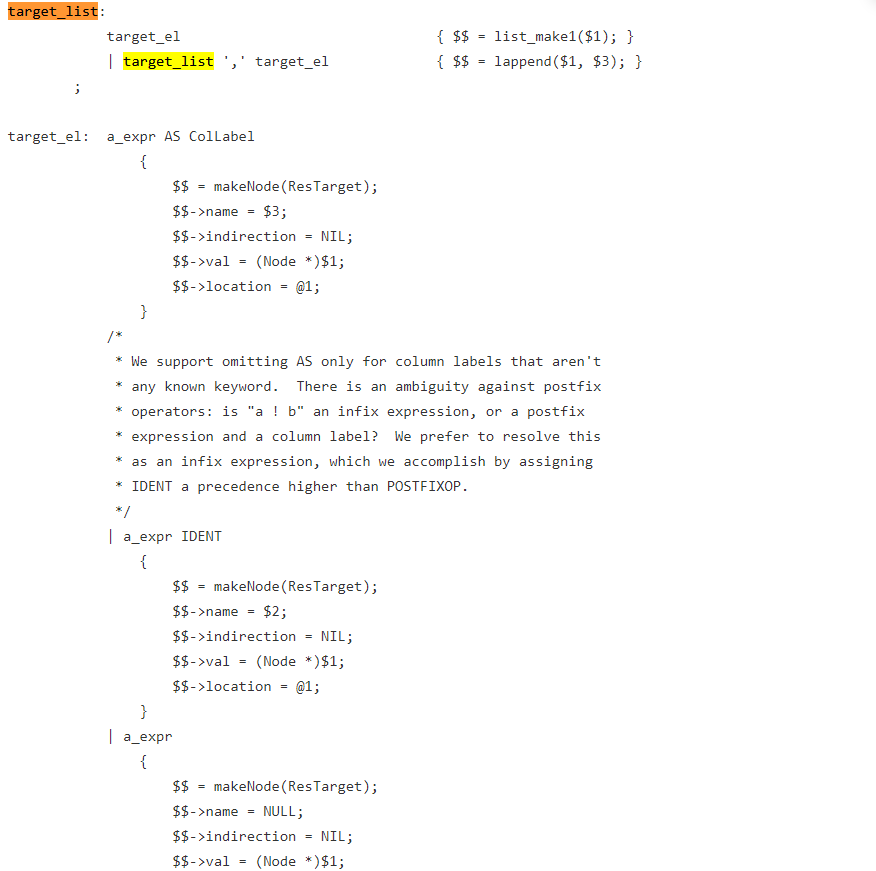 不难看出target_el的功能有很多,ident负责通过指定优先级,去实现表达式的解析以及作为表达式,取别名的表达式和“*”等,对应target_list部分进行定义。并且完成该部分的功能。而在成功匹配到功能的时候,在以已经编好的程序下,系统会产生一个名为ResTarget的结构体,该结构体的作用是储存目标对象的信息,比如名称,目标属性,各种表达式以及符号出现的位置。这就是select的目标列表