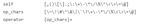 接下来看这里:self是作为单个字符返还的字符集,op_char则是可以组成op标记的字符集,可以是一个或者多个字符长,在下面的operator就是由多个operator完成的。这些集合虽然重叠,但是每个集合都有一些不在另一个集合中的字符,还是有所区别的。