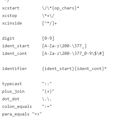 这一部分定义的是扩展注释语法,这部分和允许的运算符语法类似,但是这里实现的主要方式是让lex识别以斜杠星作为一个注释,当注释的部分不对劲的时候,就会自动跳出来,把它解释为运算符。现在,只要发现斜杠星这样的东西,lex就可以认为它是一个3字符的操作符,这里把{op_char}追加到xcstart,让它可以匹配尽可能多的{op_char}文本然后通过规则确保xcstart可以完成自己的任务,多余的东西利用yyless()放回去,避免把停止注释的操作符给一并注释掉。