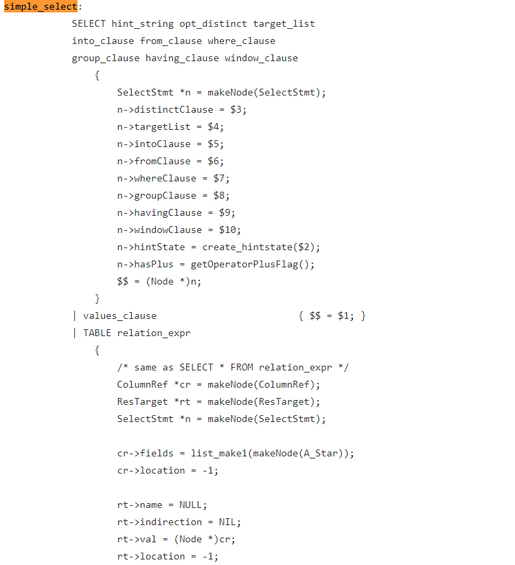 首先看simple_select,这个规则分析可以出现在集合操作中的(包括UNION、INTERSECT和EXCEPT)中的SELECT语句。可用于指定集合操作的顺序。如果没有和,那么就按照此文件开头的优先规范进行排序,排序字句的级别不完全相同。从simple_select语法分析结构可以看出,一条简单的查询语句由以下子句组成:去除行重复的distinctClause、目标属性targetList、SELECT INTO子句intoClause、FROM子句fromClause、WHERE子句whereClause、GROUP BY子句groupClause、HAVING子句havingClause、窗口子句windowClause和plan_hint子句。到这里,结构体创造完成。这里的主要目的就是为关键字select创建一个多叉树,把他的各种功能拆掉,拆成简单的功能分别实现,这样做可以减少一个函数的函数量,从而减少bug的出现。