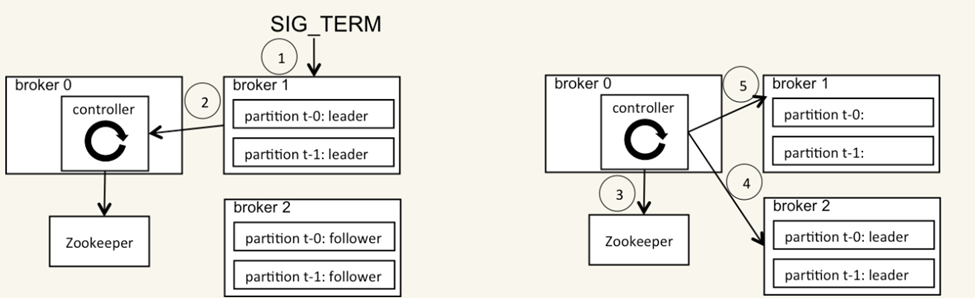 现在我们假设外部有一个请求把broker1拿shut down了,这个时候broker1就会发送一个请求到controller说我要down了,broker0收到这个请求之后会对Broker1上的partition进行一个leader的处理,这个例子中会选择broker2为新的leader,在告诉broker2之前它会先把这个新的leader的信息写到Zookeeper中,然后在通知broker2说你现在是新的leader了,最终再返回response给broker1说,好了,你现在可以shut down了。