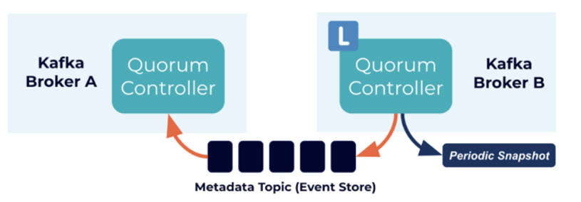 首先各个broker可以直接使用Raft来选举出来一个leader成为controller,也就是说controller的选举不需要再依赖于ZooKeeper了。我们把这个controller称之为active controller,别的broker称之为follower controller,它们replicate所有写到active controller的操作,从而成为一个随时待命的controller,当真正的active controller出问题的时候,他们能快速站出来,成为新的active的controller。这个过程就会很快,因为follower controller其实有所有需要的信息,随时处于ready的状态。