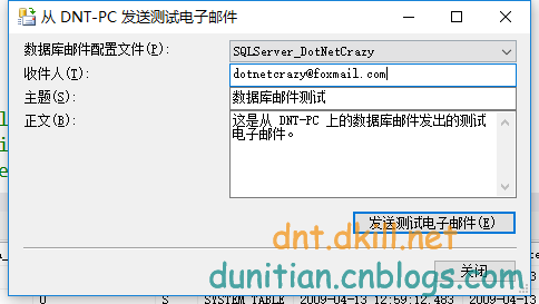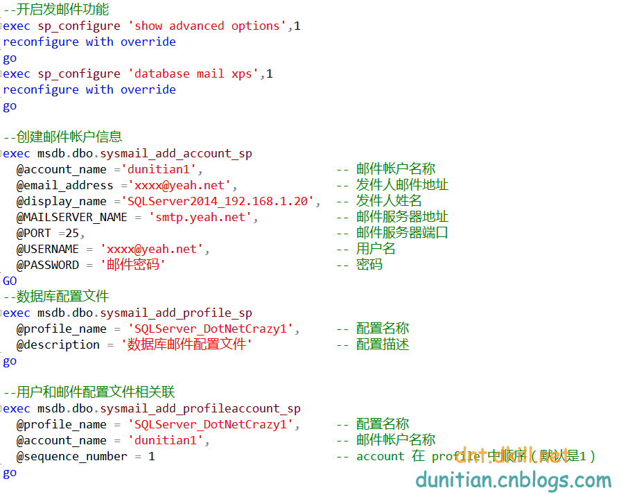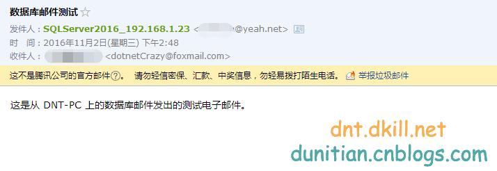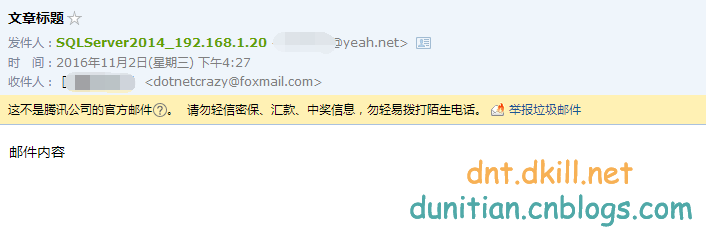 123456execmsdb.dbo.sp_send_dbmail@profile_name ='SQLServer_DotNetCrazy1',--配置名称@recipients ='dotnetcrazy@foxmail.com',--收件名称@body_format ='HTML',--内容格式@subject ='文章标题',@body ='邮件内容'结果:20的ip也发过来了