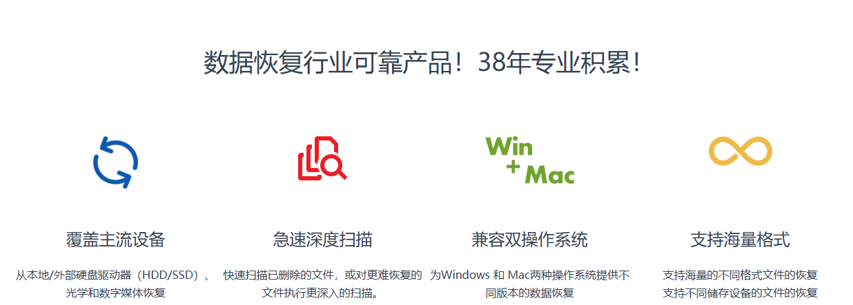 EasyRecovery (易恢复中国)是由全球著名数据厂商 Ontrack ® 出品的一款数据文件恢复软件。支持恢复不同存储介质数据:硬盘、光盘、U 盘/移动硬盘、数码相机、Raid 文件恢复等,能恢复包括文档、表格、图片、音视频等各种文件。具体来说,EasyRecovery 易恢复可以恢复多方面的数据,EasyRecovery的使用对象可以是台式机、笔记本、移动硬盘或是固态硬盘。