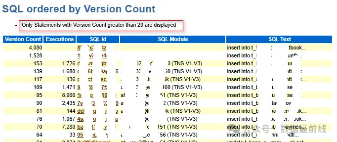 事实上,并没有一个绝对的值来界定到底多少Version Count算是高。不过子游标数量大于20的SQL语句会记录到AWR的"SQL ordered by Version Count"章节中。如果你怀疑数据库遇到类似的问题,可以从这部分内容中找出候选的SQL以进一步的分析。此外还有一个视图 v$sql_shared_cursor 来标记和区分游标不能共享的原因,该视图中记录的各种原因多达60+种,较为常见的原因有:OPTIMIZER_MISMATCH、BIND_MISMATCH、BIND_EQUIV_FAILURE等。