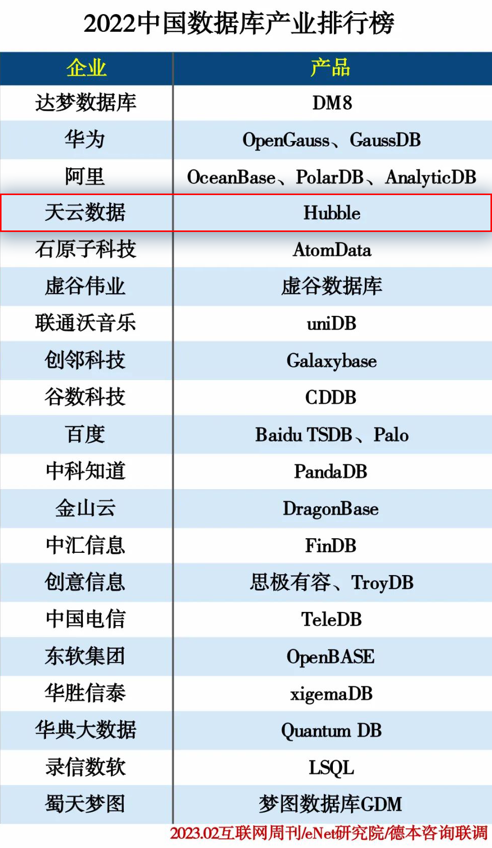 近日,《互联网周刊》、德本咨询、eNet研究院联合发布《2022中国数据库产业排行榜》榜单:天云数据实力登榜,Hubble数据库荣膺2022中国数据库产业排行榜TOP50。
