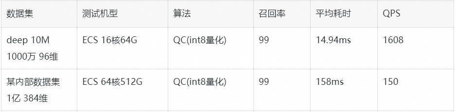 QC表示量化聚类,与Fassis的IVF类似,通过聚类的方式构建向量索引。且支持int8、int16量化,量化后能够显著地减少索引的体积,并且保证较高的召回率。适用于超大规模的向量场景,节省资源。