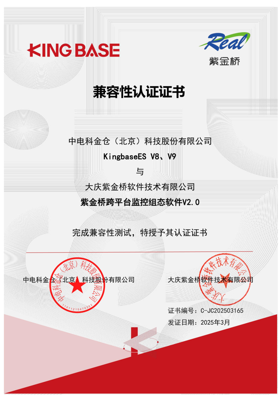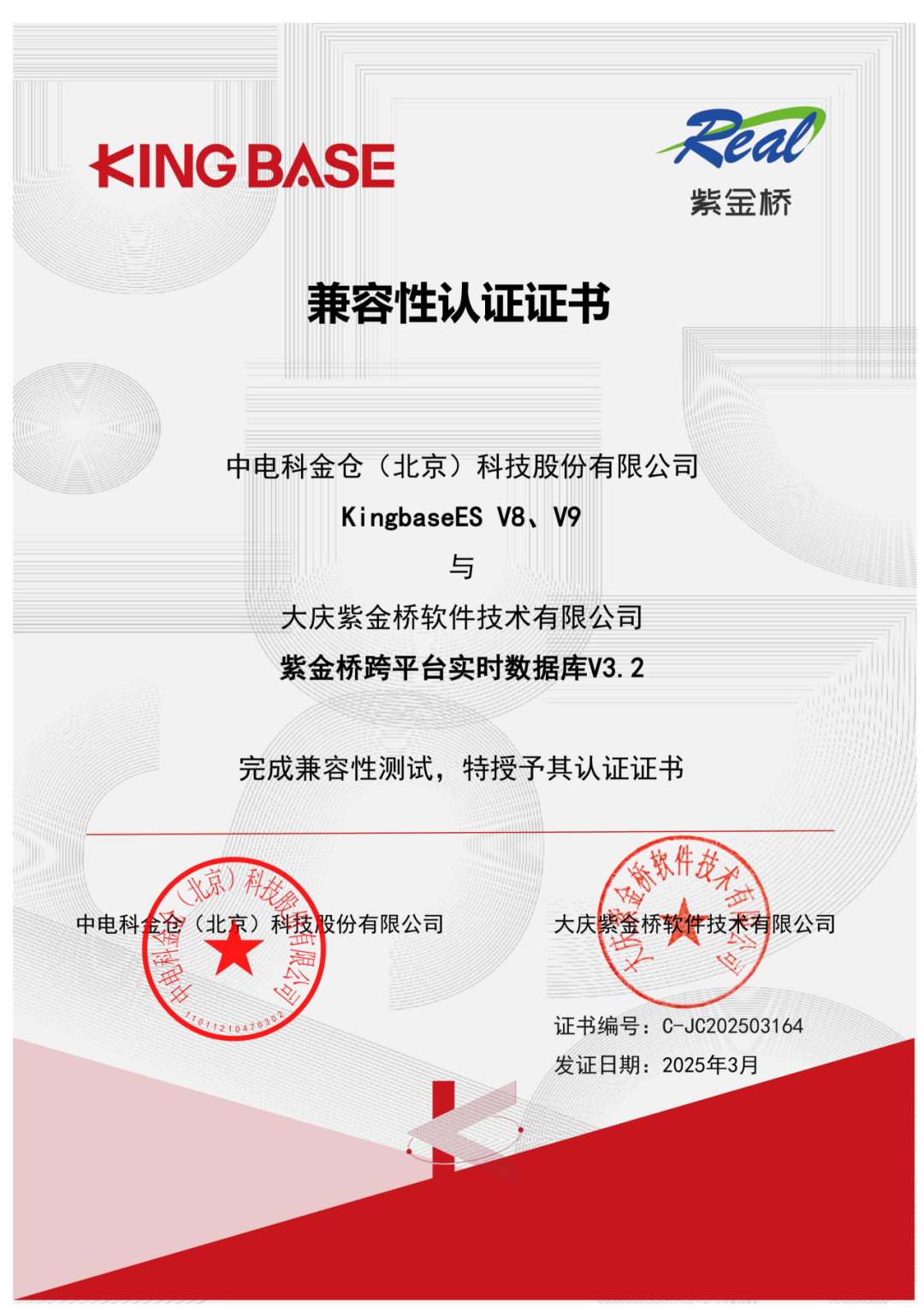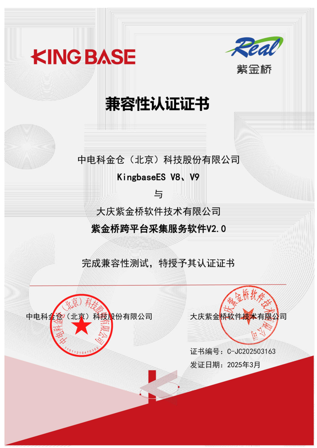 2025年3月,大庆紫金桥软件技术有限公司和中电科金仓(北京)科技股份有限公司,通过共同严格测试表明:紫金桥跨平台实时数据库 V3.2、紫金桥跨平台组态监控软件V2.0、紫金桥跨平台采集服务软件V2.0与KingbaseES V8、V9完成兼容性测试,能够达到通用兼容性要求及性能、可靠性要求,满足用户的关键性应用需求。