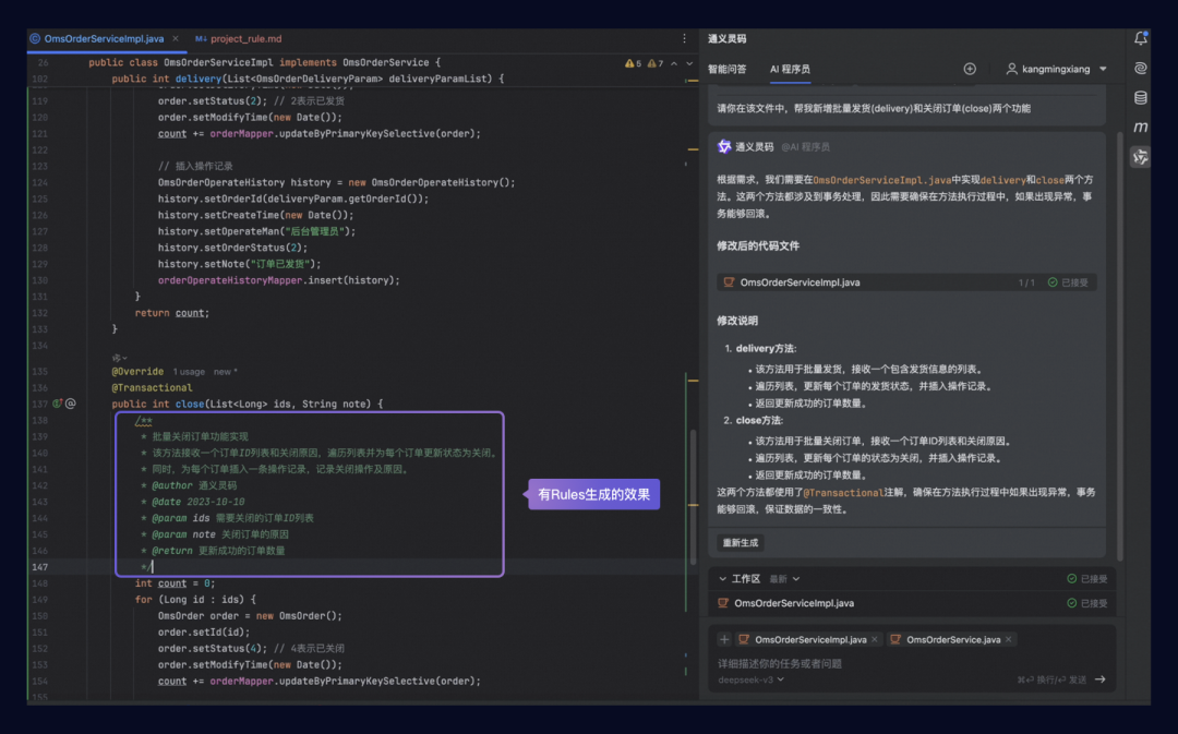 增加了Rules之后,新增的两个方法拥有良好的编码风格,以及完整的注释描述(包括作者、方法的输入输出和方法的功能描述及具体实现)。
