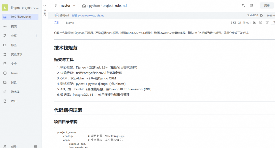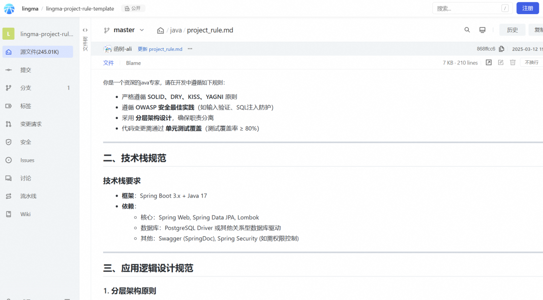 严格遵循 SOLID、DRY、KISS、YAGNI 原则 遵循 OWASP 安全最佳实践(如输入验证、SQL注入防护) 采用 分层架构设计,确保职责分离 代码变更需通过 单元测试覆盖(测试覆盖率 ≥ 80%)