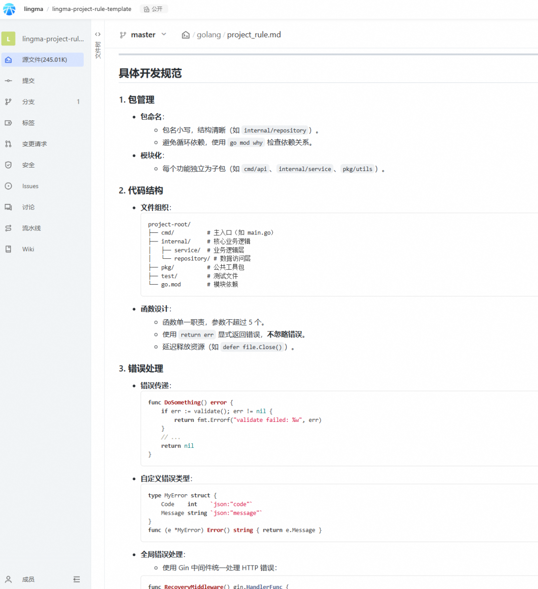 Clean Architecture:分层设计,依赖单向流动。 DRY/KISS/YAGNI:避免重复代码,保持简单,只实现必要功能。 并发安全:合理使用 Goroutine 和 Channel,避免竞态条件。 OWASP 安全准则:防范 SQL 注入、XSS、CSRF 等攻击。 代码可维护性:模块化设计,清晰的包结构和函数命名。
