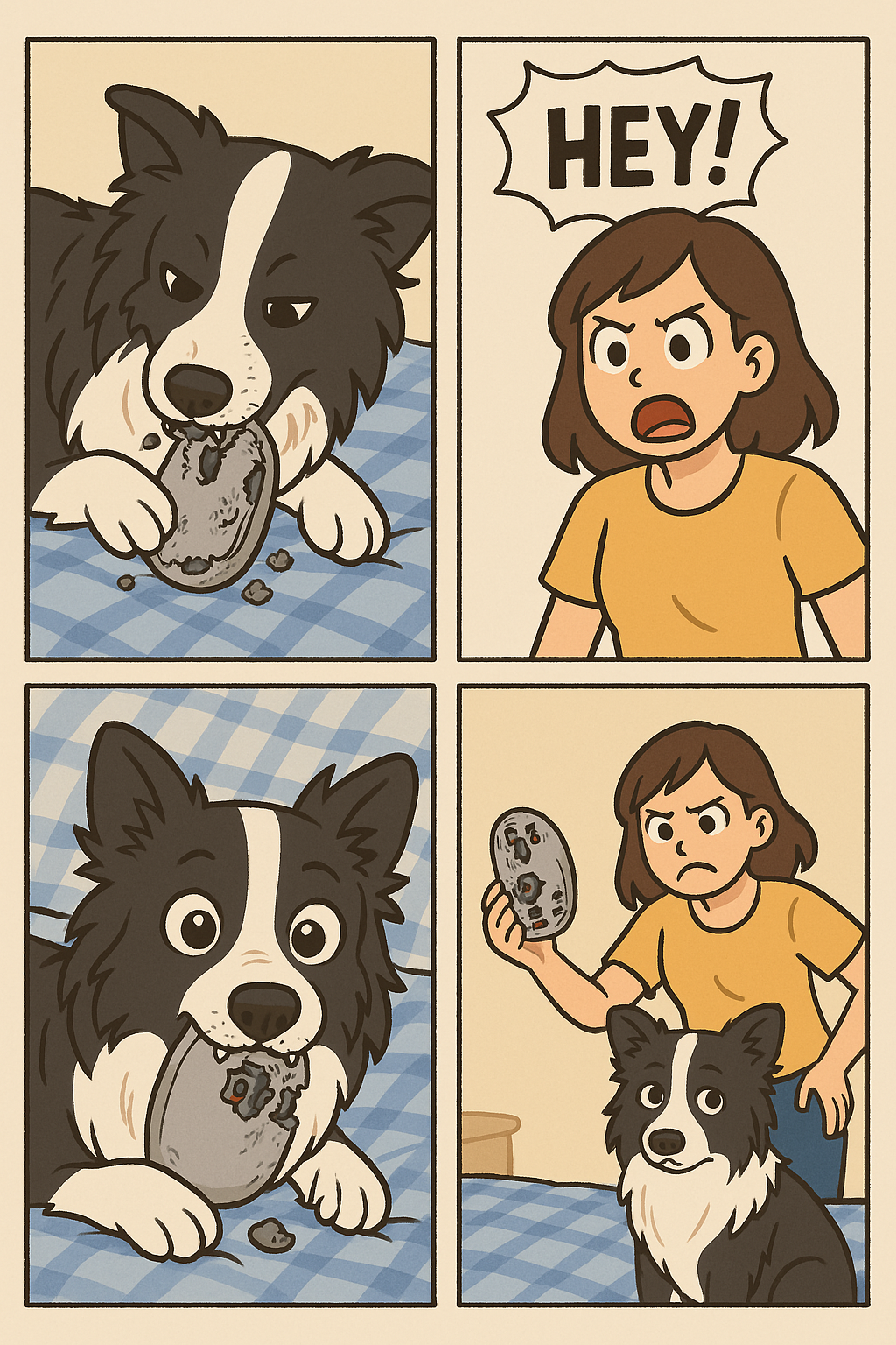 提示词:帮我生成一个四格彩色的搞笑漫画,还原一只边牧啃坏鼠标,被女主人发现,很尴尬的作案现场