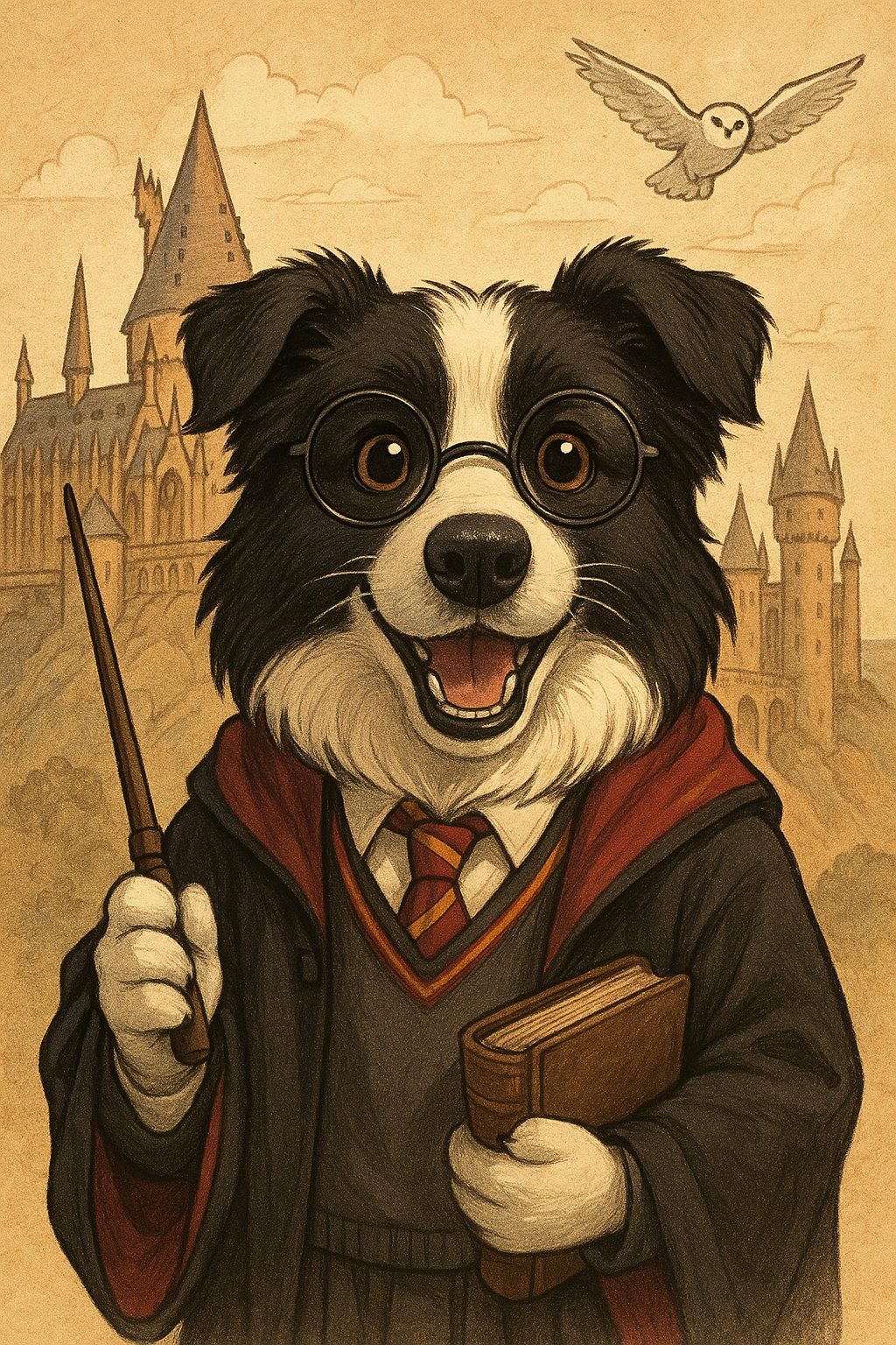 请以这只狗为原型,画这只狗去上哈利波特魔法学院的漫画图