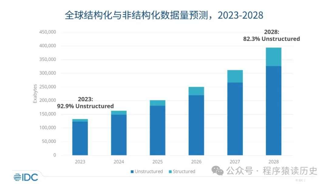 2024年10月 IDC 发布全球数据量预测报告:2028年全球数据量将增长至393.8 ZB,相比于2018年增长9.8倍。其中非结构化数据量占比,从2023年的92.9%降低至2028年的82.3%,虽然占比有所下降,但其仍然是最主要的数据形式。从IDC报告可知,未来全球数据主要以非结构化形式存在。