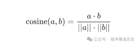 余弦相似度是通过计算两个向量夹角的余弦值来衡量相似性,等于两个向量的点积除以两个向量长度的乘积。代数公式: