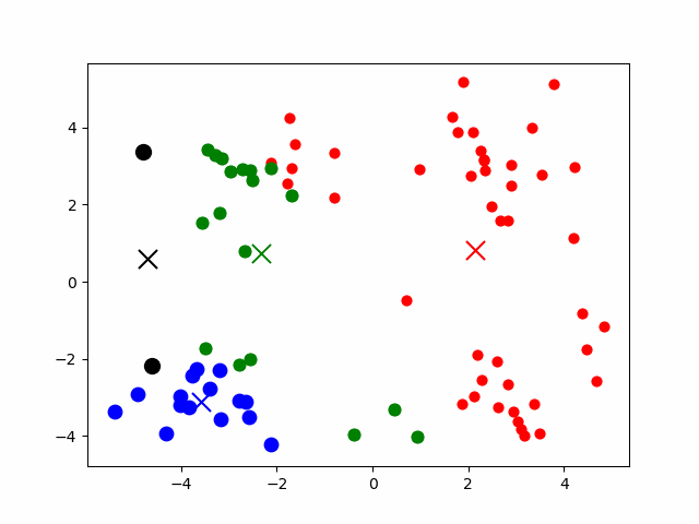 示意图中圆点是向量元素样本,X是聚类的中心点,同样颜色的圆点为一个聚类。观察示意图的变化,聚类的中心点需要进行多次迭代计算后才能稳定,实现聚类趋于稳定或者收敛。