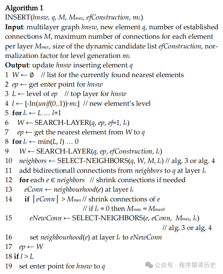 由HNSW 搜索示意图可知,随着图层数的增加,特征半径减小。因此,在较低层中节点数更多、更密集、节点间的距离更近,这保障了在低层搜索更精确的找到相似数据;而在高层中,节点数较少、相对稀疏、节点间距离较长,这保障了在高层查询中的速度。可见,HNSW 图的构建对应查询效率至关重要,这篇论文对新元素插入时的构图的构图过程也做了详细介绍。