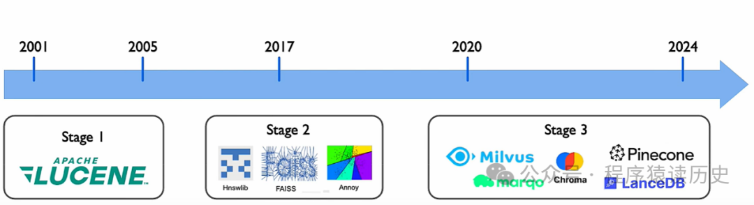 第一阶段,以 Lucene (其作者是有Hadoop 之父之称的大神 Doug Cutting)为代表,其主要功能是文件形式存储向量数据。第二阶段,2017 年Google 发表《Attention Is All You Need》以及 Facebook 开源 Faiss 框架 为标志。第三阶段,是019年以来陆续出现一些独立的向量数据库,代表产品有国内Milvus,国际上Pinecone、Chroma 等产品。