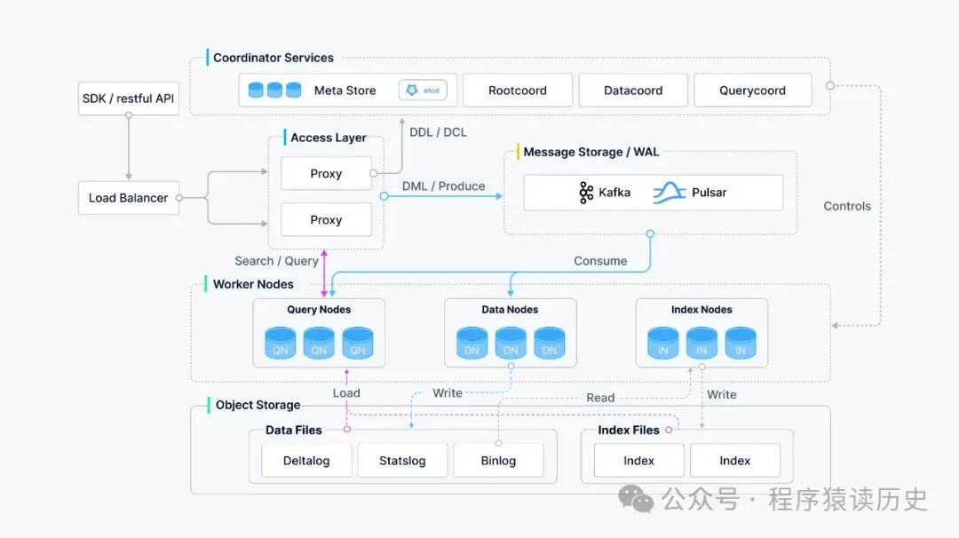 访问层由一组无状态 proxy 组成,对外提供用户连接的 endpoint,同时负责验证客户端请求;其次还提供负载均衡和提供统一的服务地址能力。接入层负责验证客户端请求并减少返回结果。此外 Milvus MPP 架构,proxy还承担着聚合和后处理中间结果的职责,对查询结果进行整合、筛选,最终结果返回给客户端 。