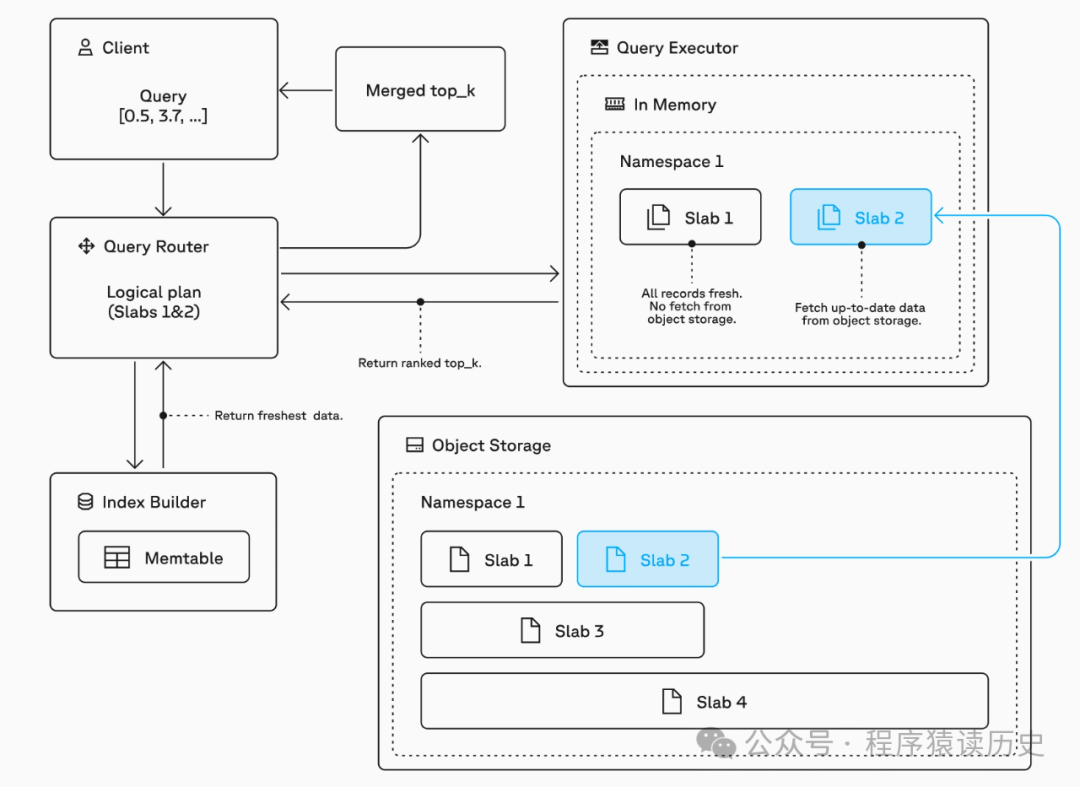 每个查询执行器扫描其负责的数据库块(slabs) ,并将 top_k 候选列表返回给查询路由器。如果查询包含元数据过滤器,执行器在确定 top_k 候选之前会排除不符合指定标准的记录。在大多数情况下,数据块会在执行器的内存和 SSD 之间进行缓存,从而实现可预测的高查询性能。。如果数据库未缓存,执行器将从对象存储中检索它,并为未来的查询缓存它。这通常发生在层首次访问或有一段时间未被查询时。