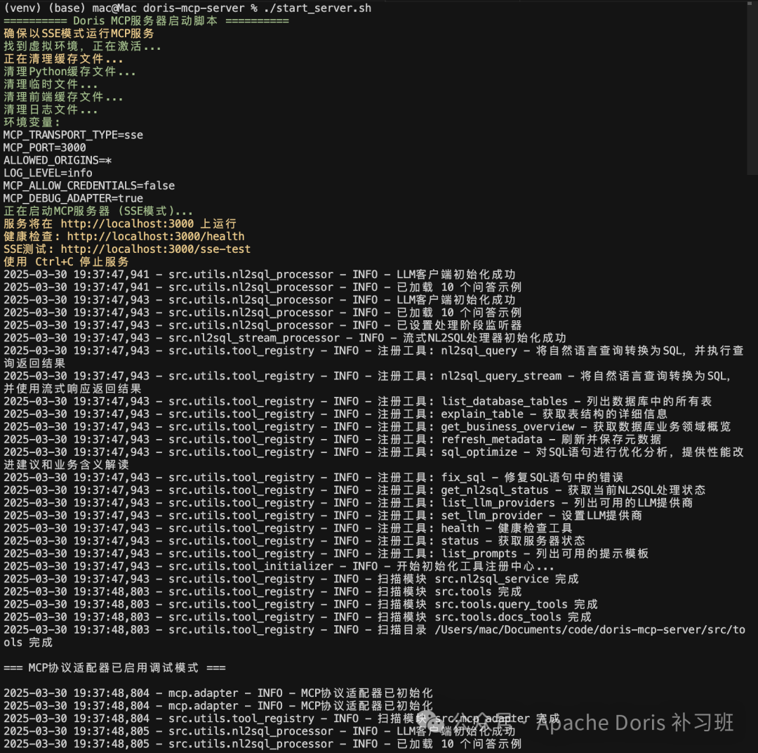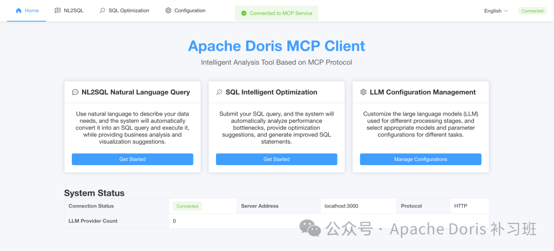 Apache Doris MCP Server 基于前沿的大语言模型技术,结合 Doris 数据库的独特优势,为用户提供了一套全面而强大的数据交互和分析工具。系统采用模块化设计,可灵活扩展,旨在打通从数据存储到数据理解的全链路,使得数据分析和使用变得更加简单高效。