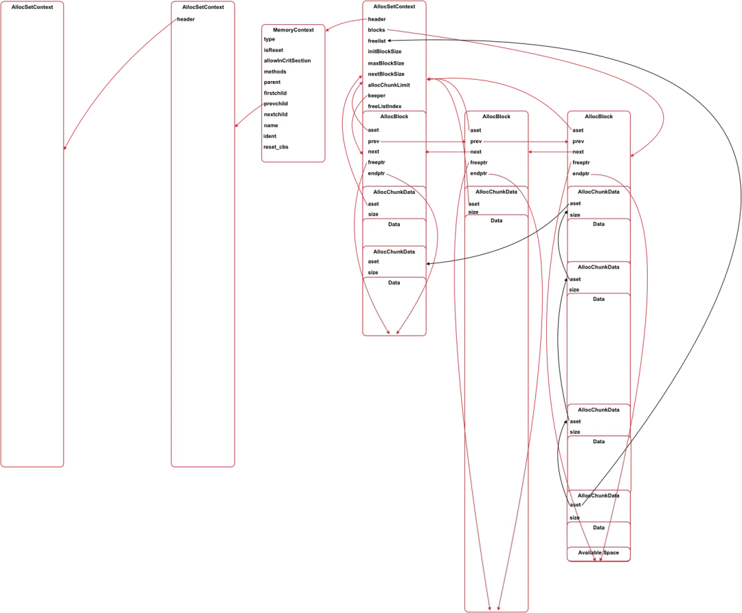 MemoryContext(这里指的是指针名称),AllocSetContext,AllocBlock,AllocChunk是上面四者的指针类型,下文阐述时会以带有Data的名称表示这四种结构。