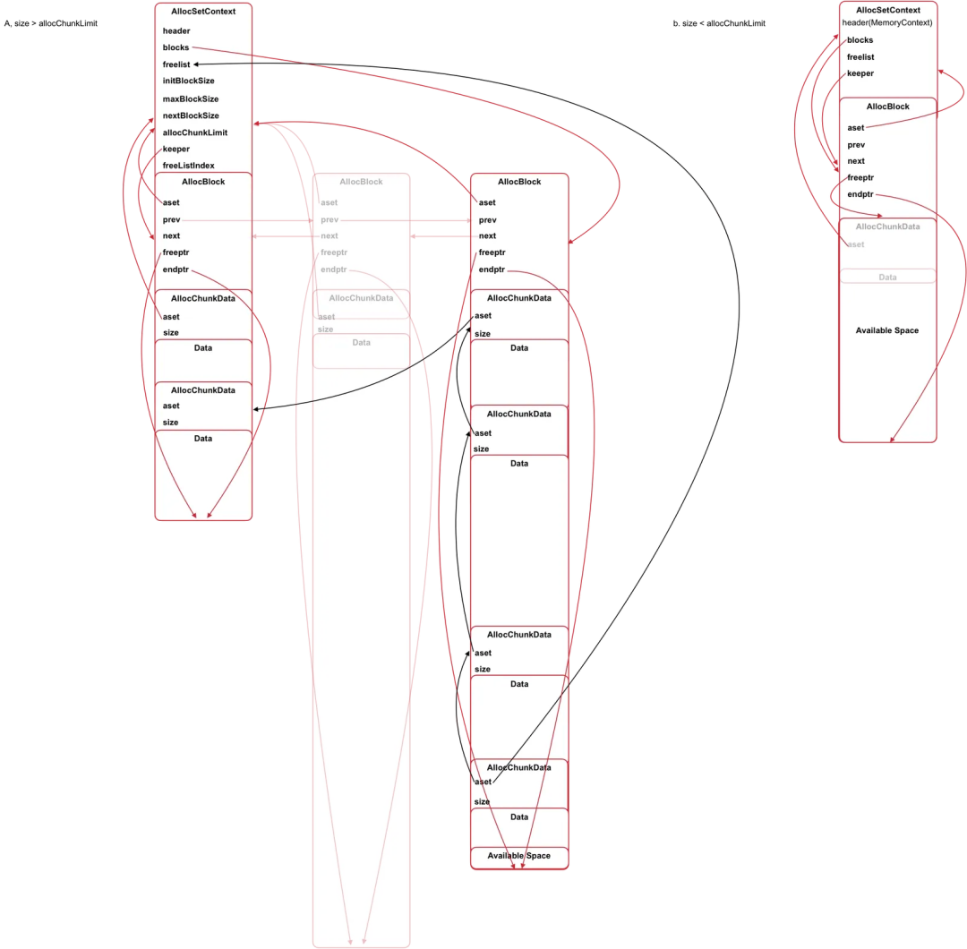 AllocBlockData是进程用来分配、释放的内存单元,通过malloc申请。AllocChunkData是用户存放数据的内存单元,通过palloc申请,其中已经使用的AllocChunkData的aset将会指向所属的AllocSetContextData;如果是空闲未使用的将会指向freelist中的下一个成员变量(没有则为空)。一个AllocBlockData具有一个或多个AllocChunkData。^[2]^