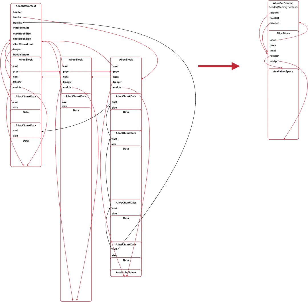 其次在PostgreSQL这样工程较为庞大,函数调用较为复杂的数据库管理系统内,对于内存的管理,如果使用malloc和free进行内存的申请和释放,是很难做到尽善尽美。在7.0之前的版本中,PG以指针传递来处理大量查询,并且在查询结束后回收内存,因此存在着内存泄漏的风险。尤其是处理TOAST数据时,需要使用大量的内存,使得这个问题尤其明显。