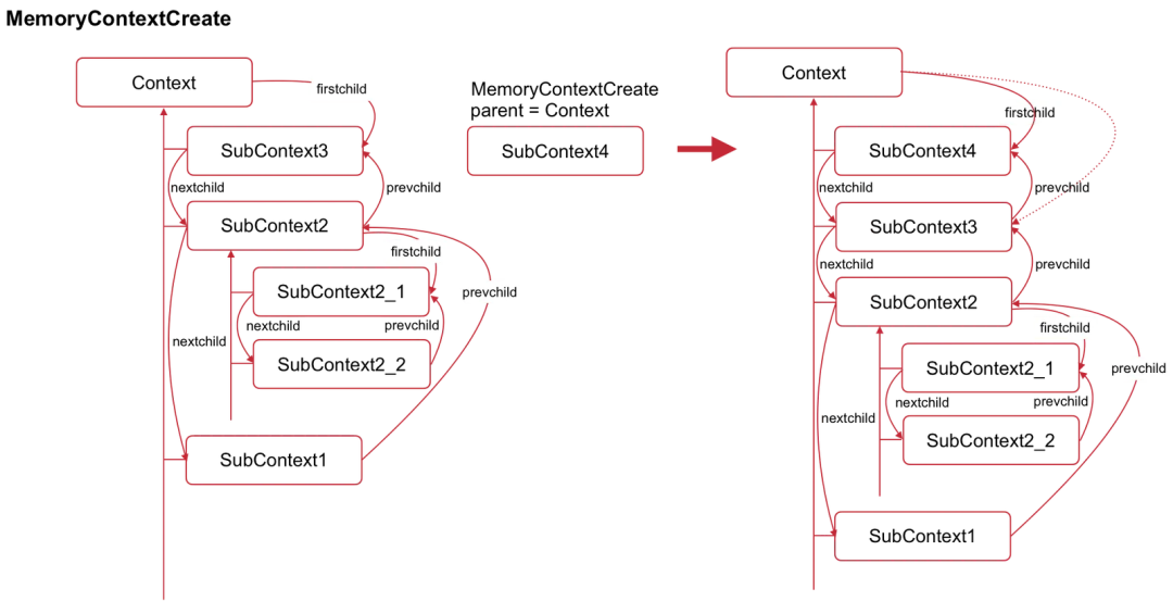 * 则将新的MemoryContext作为父节点的第一个子节点