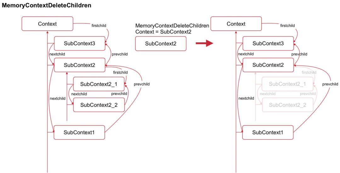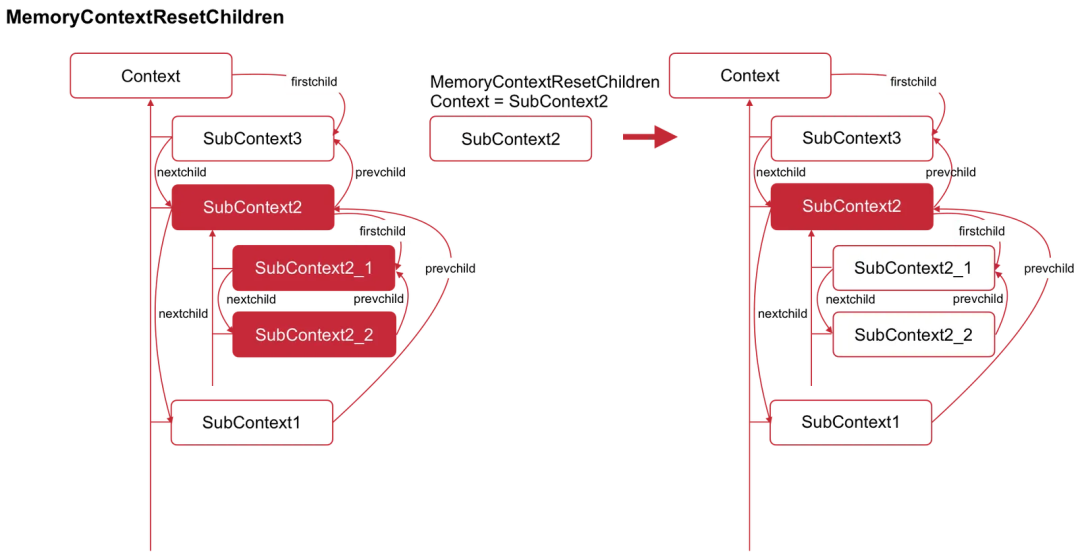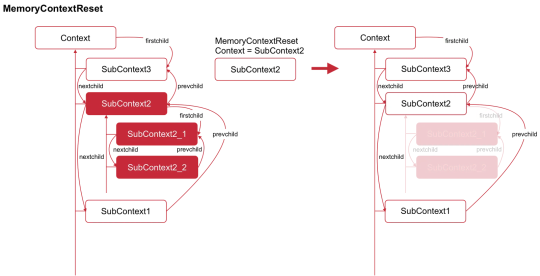 parent,prevchild,nextchild组成内存上下文的树形结构,方便在重置或删除内存上下文时查找子节点,分别表示父节点,同一个父节点下的prev节点,同一个父节点下的next节点