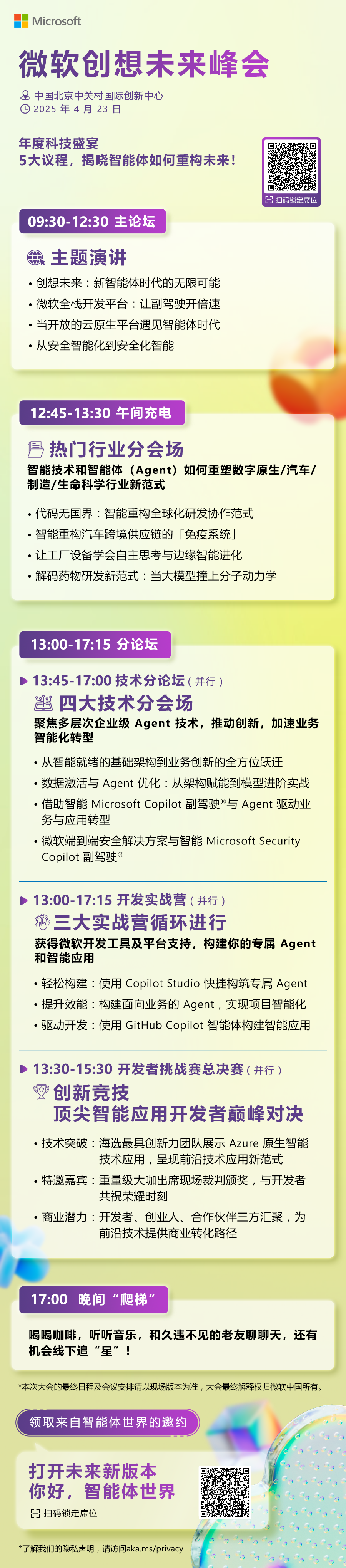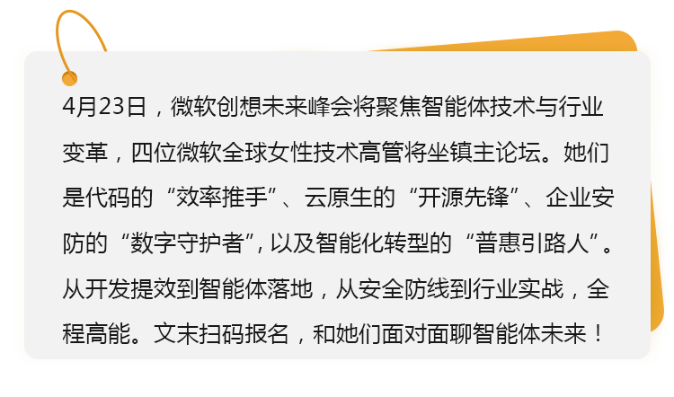 4月23日,微软创想未来峰会将聚焦智能体技术与行业变革,四位微软全球女性技术高管将坐镇主论坛。她们是代码的“效率推手”、云原生的“开源先锋”、企业安防的“数字守护者”,以及智能化转型的“普惠引路人”。从开发提效到智能体落地,从安全防线到行业实战,全程高能。