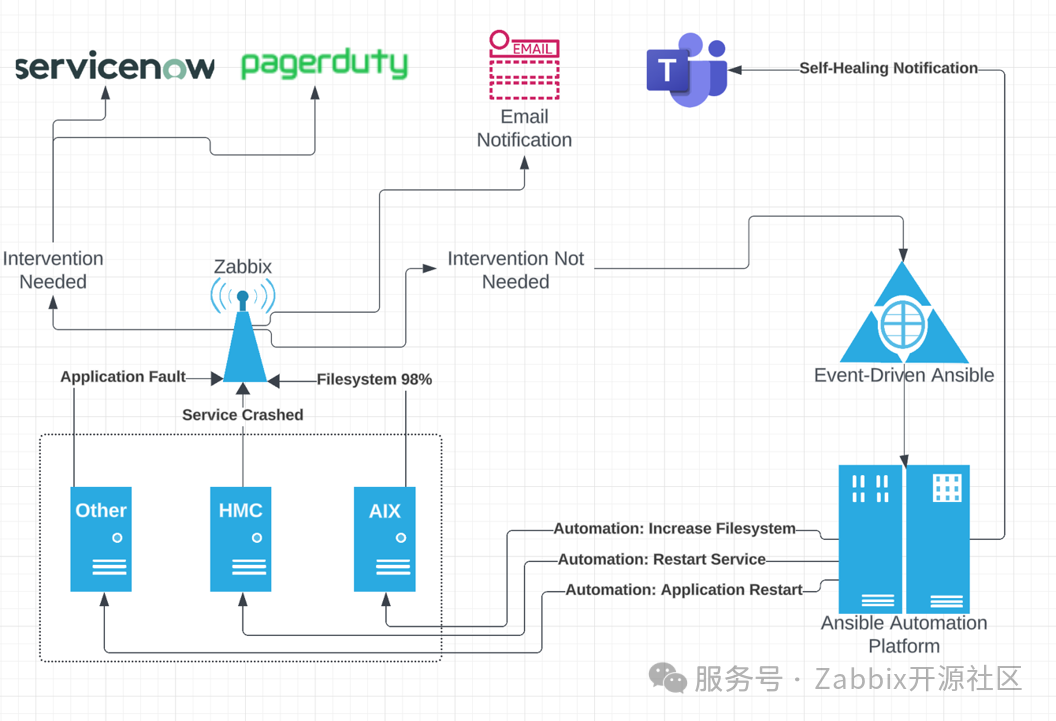 该集成方案具备智能分流机制:需要人工介入的告警,会通过多种渠道推送至ServiceNow;可自动化处理的故障,则交由事件驱动型Ansible在所有受监控主机上执行修复。