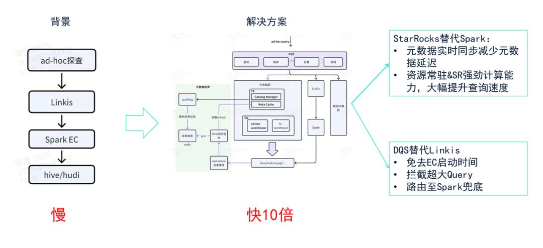 团队设计了全新的查询加速方案:通过 Flink 实时同步 Metastore 元数据至镜舟数据库,消除元数据获取延迟;利用镜舟数据库的资源常驻能力,避免每次查询的资源申请开销;结合自研 DQS 服务替代 Linkis,简化查询路径并增强稳定性保障。