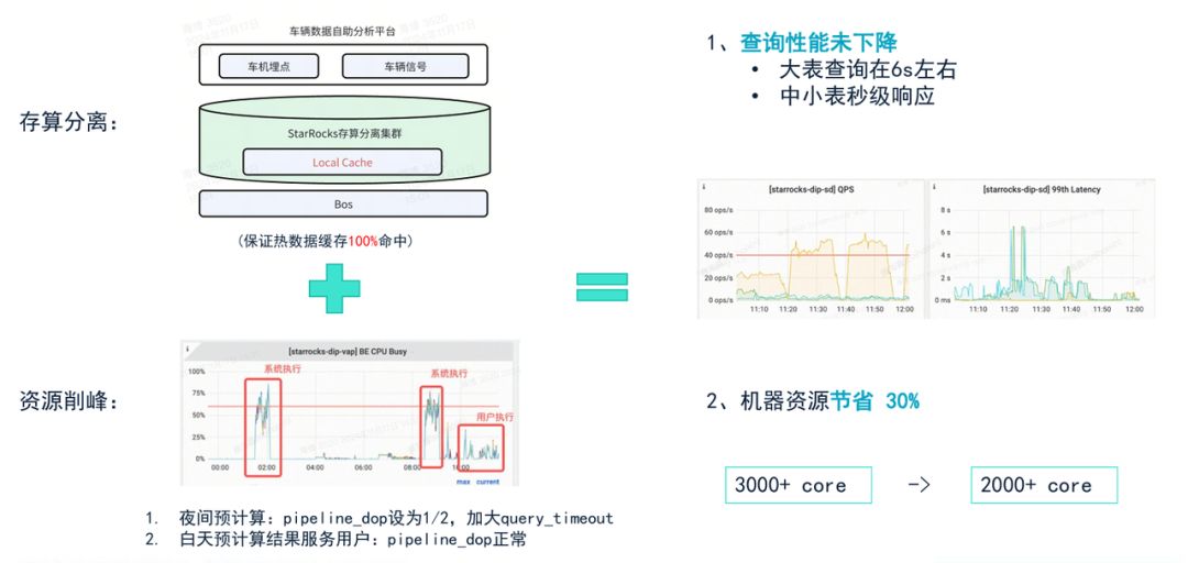 团队还在业务层面实施了资源削峰措施,即夜间预先计算结果,降低 CPU 并行度,白天直接查询预计算结果。这种用时间换空间的策略,将夜间预计算的资源需求控制在一个合理水平,为日间高峰期留出足够余量。